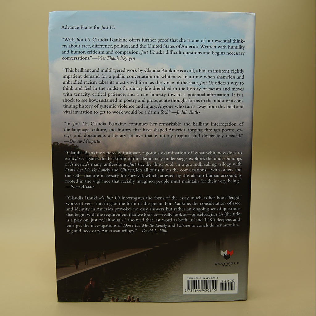 As everyday white supremacy becomes increasingly vocalized with no clear answers at hand, how best might we approach one another? Claudia Rankine, without telling us what to do, urges us to begin the discussions that might open pathways through this divisive and stuck moment in American history. Just Us is an invitation to discover what it takes to stay in the room together, even and especially in breaching the silence, guilt, and violence that follow direct addresses of whiteness. Rankine’s questions disrupt the false comfort of our culture’s liminal and private spaces―the airport, the theater, the dinner party, the voting booth―where neutrality and politeness live on the surface of differing commitments, beliefs, and prejudices as our public and private lives intersect. This brilliant arrangement of essays, poems, and images includes the voices and rebuttals of others: white men in first class responding to, and with, their white male privilege; a friend’s explanation of her infuriating behavior at a play; and women confronting the political currency of dying their hair blond, all running alongside fact-checked notes and commentary that complements Rankine’s own text, complicating notions of authority and who gets the last word. Sometimes wry, often vulnerable, and always prescient, Just Us is Rankine’s most intimate work, less interested in being right than in being true, being together.