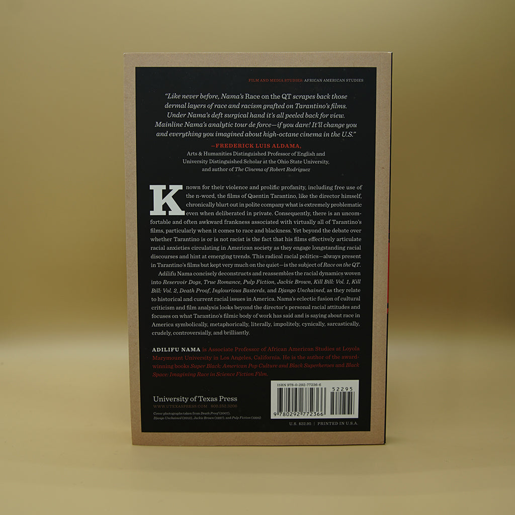 Known for their violence and prolific profanity, including free use of the n-word, the films of Quentin Tarantino, like the director himself, chronically blurt out in polite company what is extremely problematic even when deliberated in private. Consequently, there is an uncomfortable and often awkward frankness associated with virtually all of Tarantino’s films, particularly when it comes to race and blackness. Yet beyond the debate over whether Tarantino is or is not racist is the fact that his films effectively articulate racial anxieties circulating in American society as they engage longstanding racial discourses and hint at emerging trends. This radical racial politics—always present in Tarantino’s films but kept very much on the quiet—is the subject of Race on the QT. Adilifu Nama concisely deconstructs and reassembles the racial dynamics woven into Reservoir Dogs, True Romance, Pulp Fiction, Jackie Brown, Kill Bill: Vol. 1, Kill Bill: Vol. 2, Death Proof, Inglourious Basterds, and Django Unchained, as they relate to historical and current racial issues in America. Nama’s eclectic fusion of cultural criticism and film analysis looks beyond the director’s personal racial attitudes and focuses on what Tarantino’s filmic body of work has said and is saying about race in America symbolically, metaphorically, literally, impolitely, cynically, sarcastically, crudely, controversially, and brilliantly.